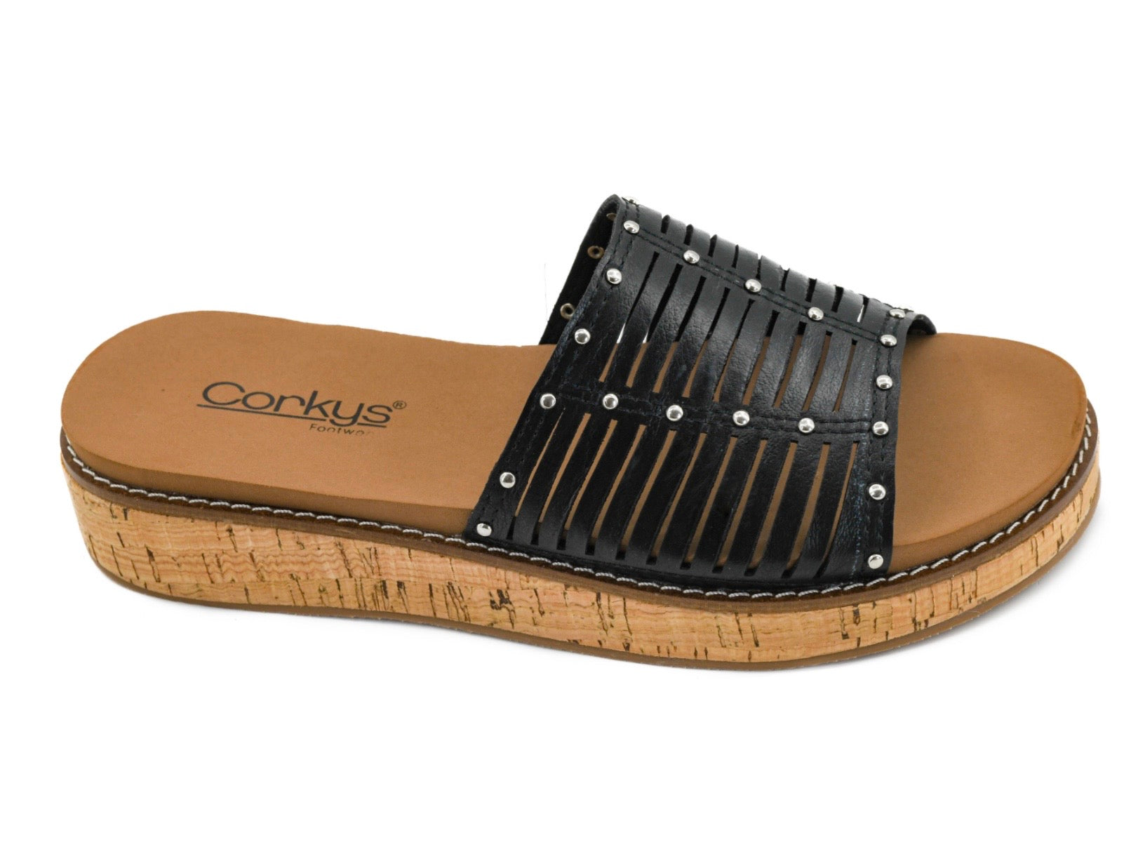 Super comfortable slide with cushioned insole and a 1" cork heel.