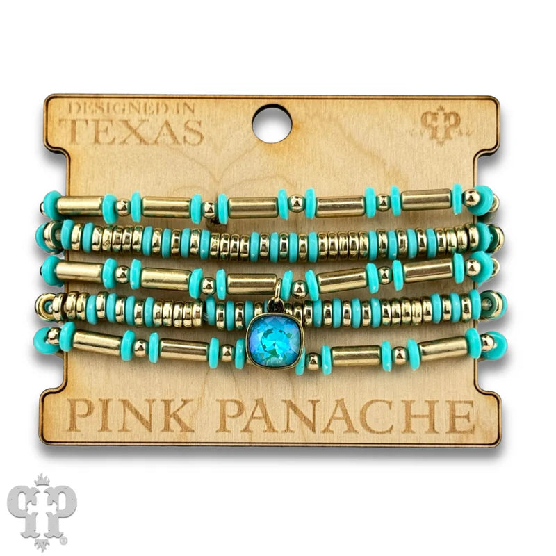 This bracelet set has colorful and gold tone disc beads with some tube beads mixed in. The charm is a 10mm Austrian crystal in a setting custom made for Pink Panache in the USA. It easily stretches and one size fits most.