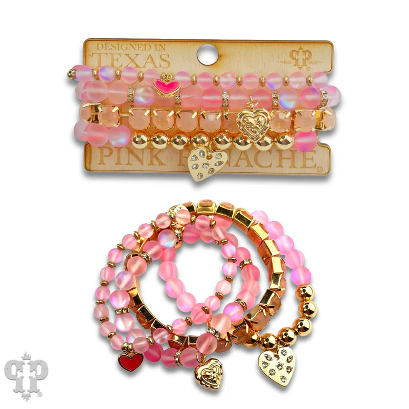 This bracelet set has four strands of mixed beads including one strand of prong set rhinestones. The charms are hearts in a variety of styles, the largest has inset rhinestones.