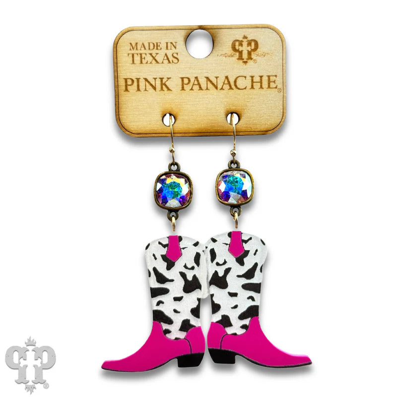 This earring has a cow print acrylic cowboy boot. It hangs from an Austrian crystal on a french hook.