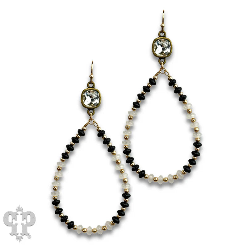 These teardrop earrings have colorful saucer beads with tiny gold tone beads mixed in. They hang from an Austrian crystal in a setting custom made for Pink Panache in the USA.