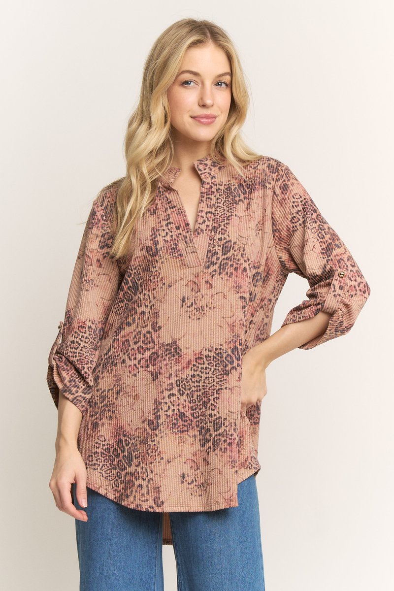 THREE QUARTER ROLL UP BUTTON SLEEVE MANDARIN COLLAR ANIMAL URBAN RIB TOP PLUS