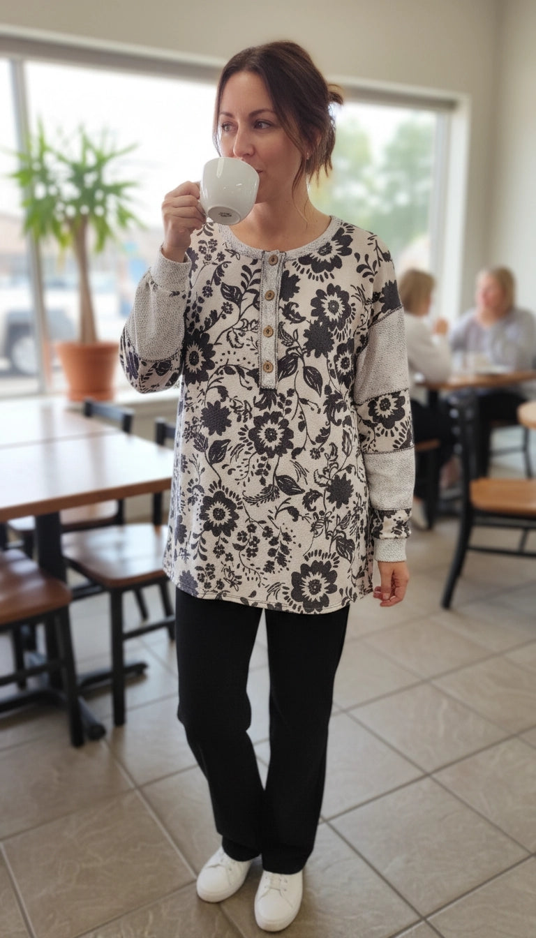 Long sleeve, Henley style with reverse accents. 95% polyester, 5% spandex.