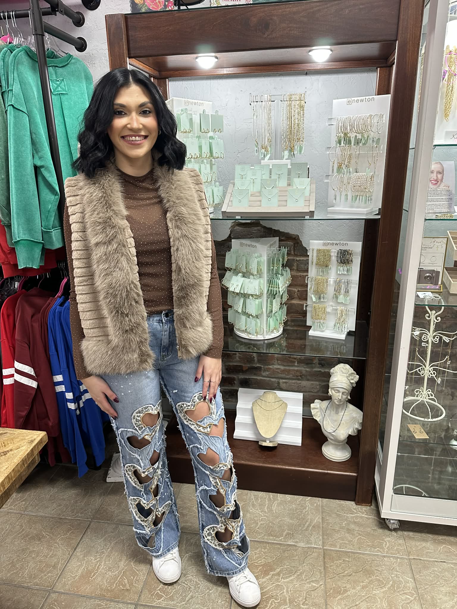 Experience the blend of beauty and comfort with our exquisite vests. Slip your hands into the convenient side seam pockets, perfect for keeping essentials close or warming up on a chilly day. Fully lined and secured with a zipper closure, it sports two exquisite fur textures, including a lavish fur collar, and wraps you in unparalleled coziness and style. Vest Fur Jacket With Collar, Side Pockets, Zipper Closure, 24.5"L X 23"W