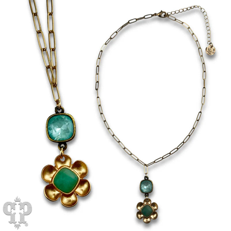 This paperclip chain necklace has a cute flower charm with mint color stone center. The flower hangs from a 10mm mint Austrian crystal in a setting custom made for Pink Panache in the USA. It measures approximately 16 inches in length and has an extender chain.