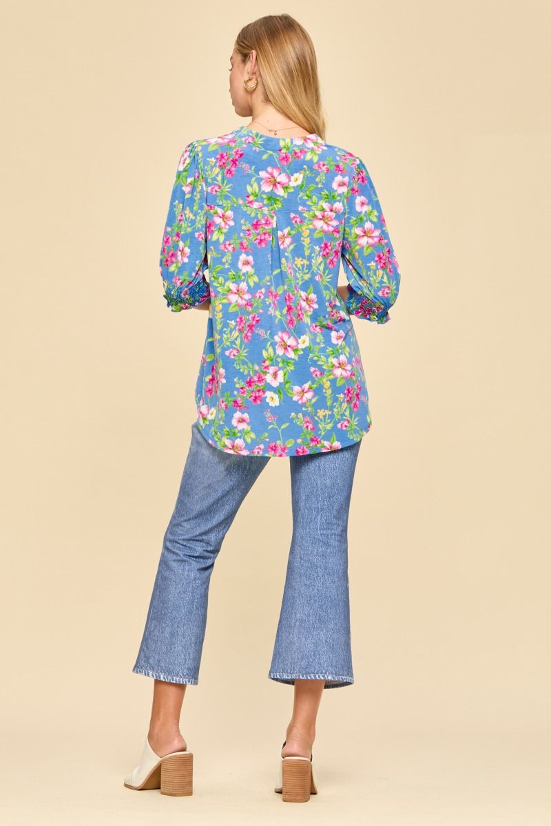 3/4 sleeve with smocked elastic, v-neck with mandarin collar. Polyester & spandex.