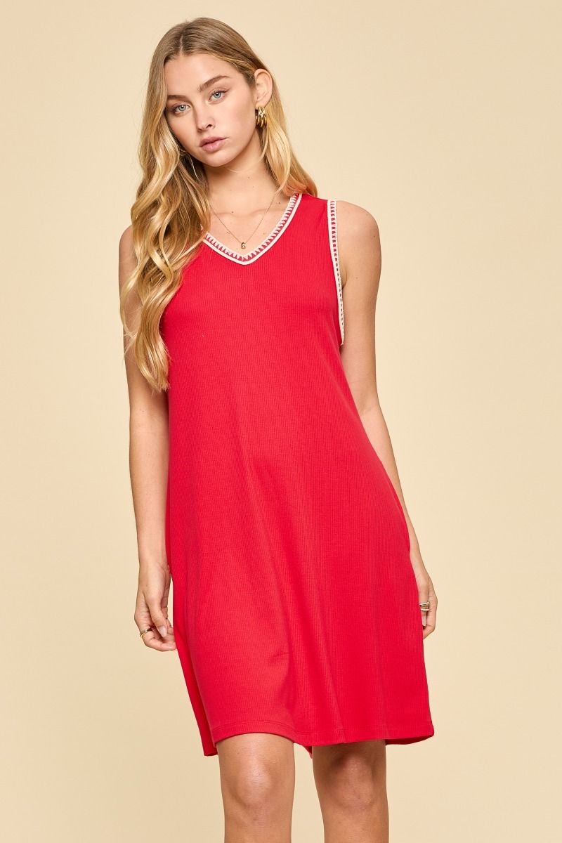 V-neck with white alpine stitching and trim around the neck and sleeves. Side pockets. 93%rayon, 7% spandex.