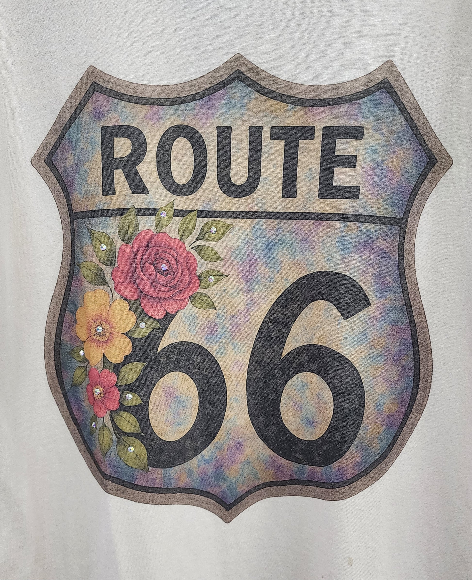 Cruise down memory lane in this eye-catching Route 66 Tee, where vintage Americana meets modern flair. Featuring an antiqued Route 66 sign with a dreamy tie-dyed backdrop of soft blues and purples, this khaki tee celebrates iconic style. Delicate flowers—including a striking red rose—are adorned with shimmering rhinestones that catch the light with every move. Crafted from Gildan Softstyle 100% cotton, it's incredibly comfortable for all-day wear. Perfect for road trip enthusiasts, vintage lovers, and anyone seeking a conversation-starting piece that blends nostalgia with contemporary edge.