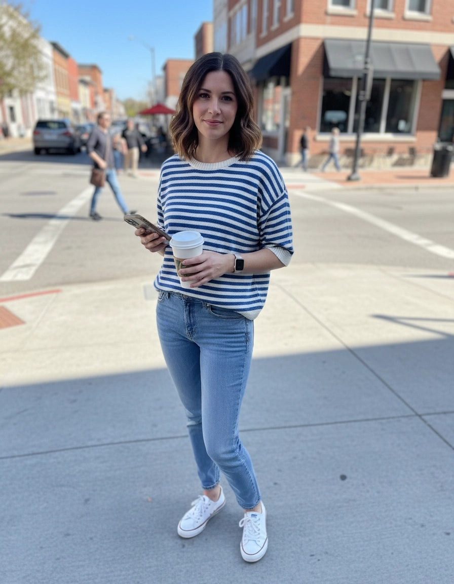 Discover the perfect balance of style and comfort with this striped knit sweater. The sophisticated cream and peacock blue stripes create visual interest, while the cream trim adds a polished finishing touch. Crafted from a durable cotton-polyester blend—74% cotton and 26% polyester—this sweater feels luxuriously soft while resisting wrinkles and maintaining its shape. Short sleeves make it versatile enough to wear layered through cooler months or on their own when temperatures warm up. Whether you're dressing up for brunch or keeping it casual, this timeless piece transitions seamlessly from day to night, making it an investment-worthy addition to any closet.