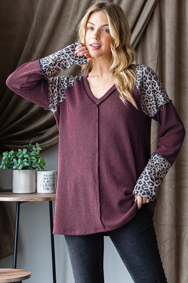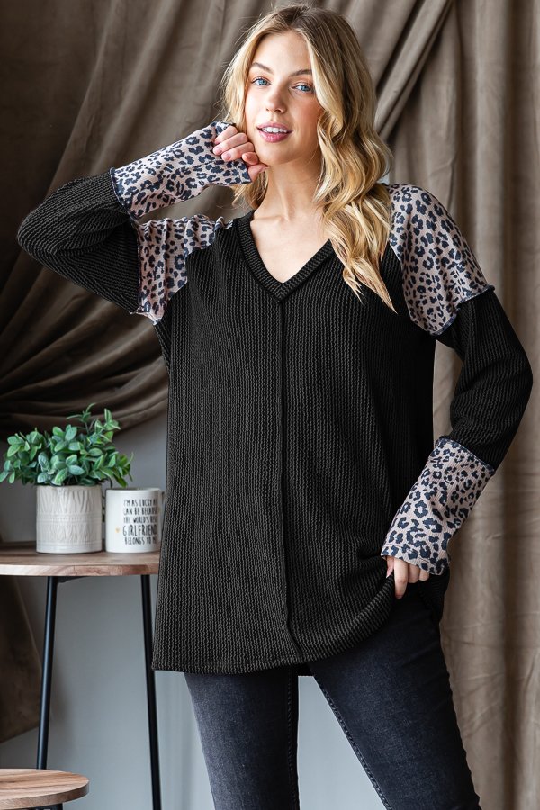 Embrace your wild side with this striking long-sleeved top that blends comfort with bold style. Featuring eye-catching leopard print accents on the sleeves, a flattering V-neckline, and a sleek straight hem, this piece makes an effortless statement. The front outseam detail adds dimension and visual interest, while the polyester-spandex blend ensures a soft, flexible fit that moves with you throughout your day. Perfect for layering or wearing solo, this versatile top transitions seamlessly from casual outings to weekend adventures. Make it your go-to for looks that turn heads.
