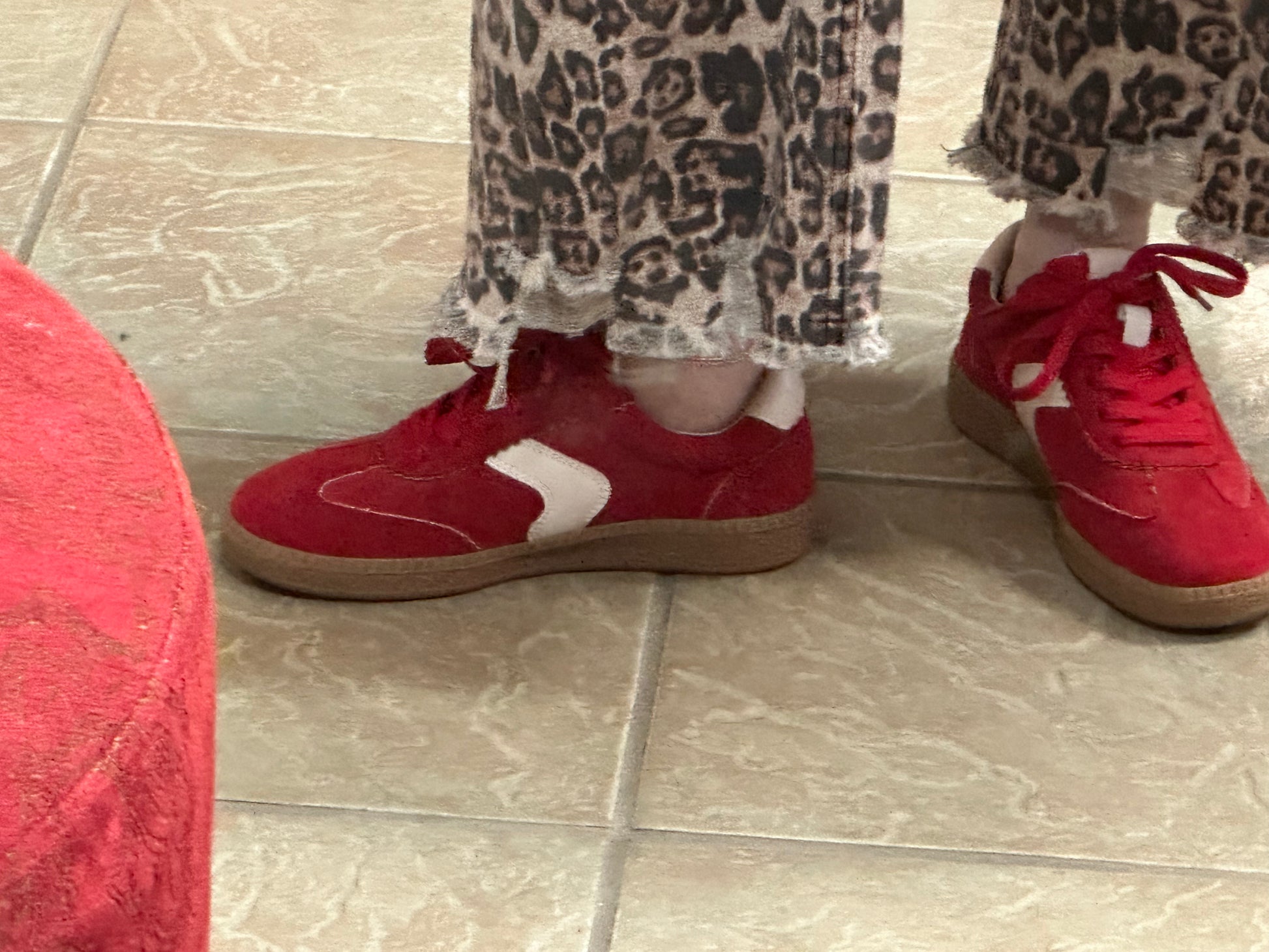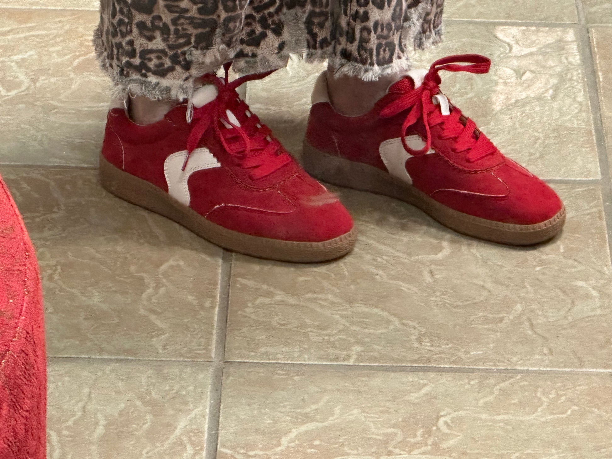 Stylish red faux suede sneaker with white accents. 2 sets of laces one red and one white.