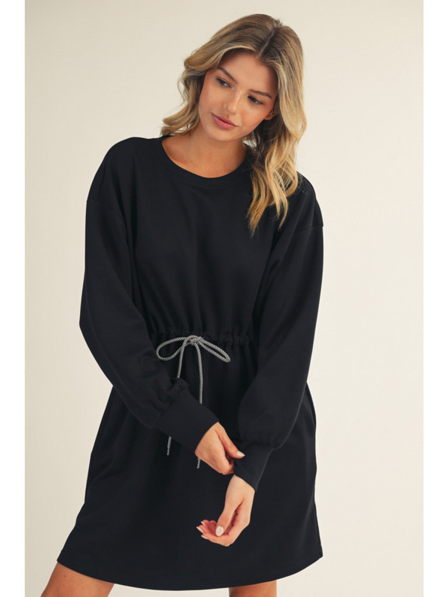 Experience effortless style with this casual dress featuring a drawstring waist for a customizable fit, long sleeves for added comfort, and convenient side pockets. Made from a soft polyester, rayon, and spandex blend, it offers exceptional comfort all day long.