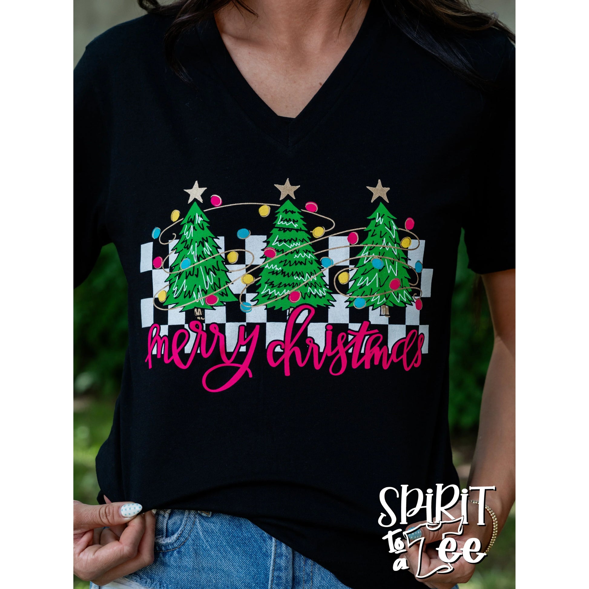 Celebrate the season in style with the "Trees with Check" V-Neck Black Tee. Featuring three festive trees against a charming checkered backdrop, this cozy and cute tee adds a perfect touch of holiday spirit to your wardrobe. A favorite among local boutiques, its flattering V-neck design makes it both comfortable and stylish for everyday wear. Make this standout seasonal piece yours and spread festive cheer wherever you go.