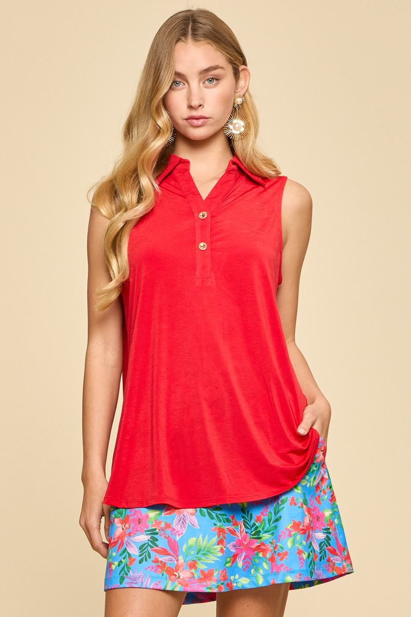 This top is perfect for those hot summer days. Sleeveless collared top with gold buttons to dress it a little. Polyester & spandex.